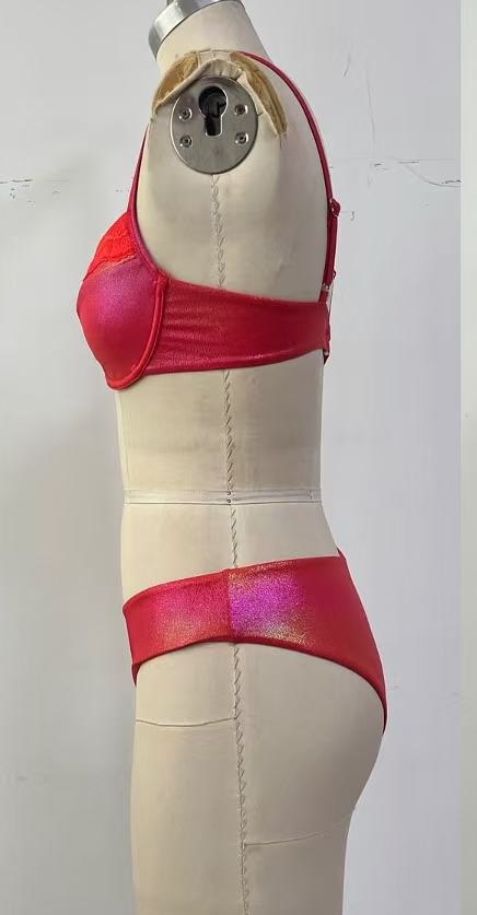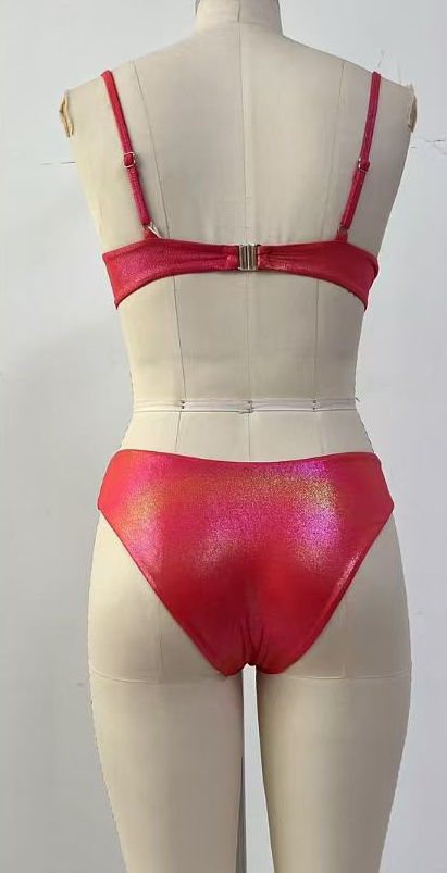 It features an underwired bikini top with delicate lace detailing and adjustable straps, paired with matching high - cut bottoms. The glossy fabric adds a touch of glamour, making it a perfect choice for those who want to make a bold and chic statement by the beach or at the pool this summer.